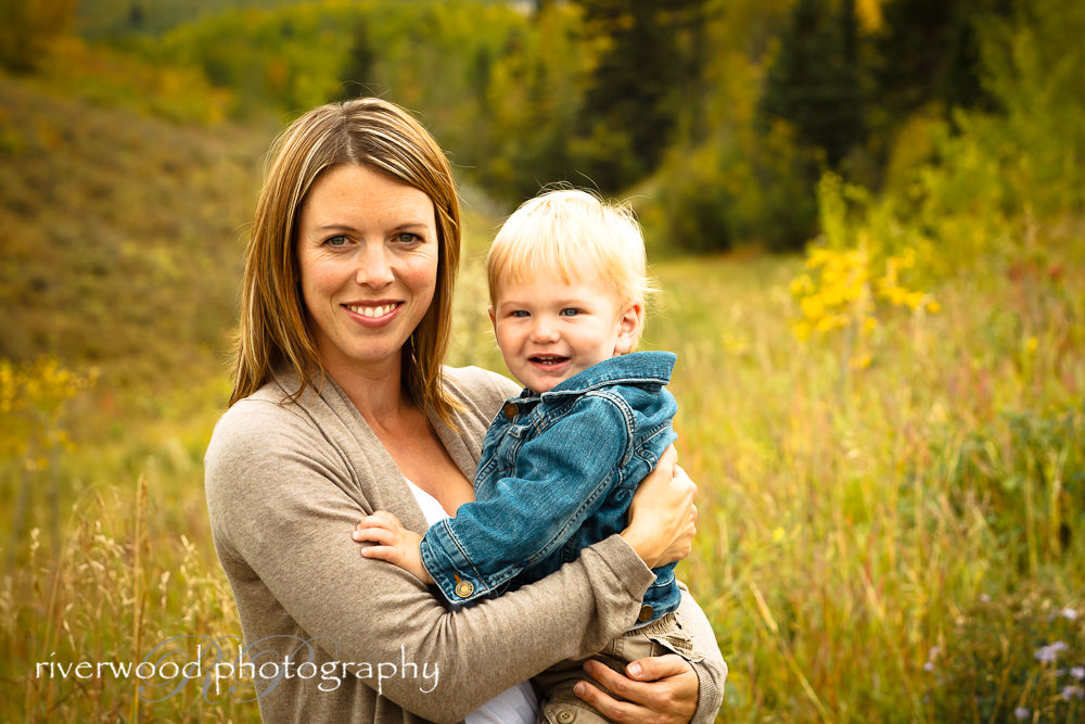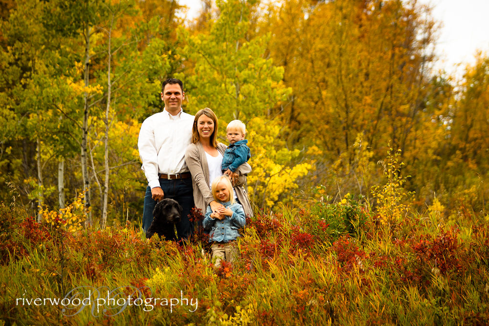 After finishing up inside we went outside to take advantage of a beautiful fall day in Calgary. They live in a prime location adjacent to a very scenic “green” space. I have to put green in quotes because, although the session was completed in early September, the fall colors had already fully arrived. The weather was fantastic and the scenery was perfect to make some lovely fall portraits of the family! I love doing this kind of session where there’s lots of variety and the images are all very different. It was a very fun session and it was great hang out with my friends!